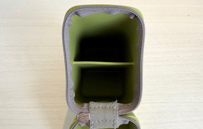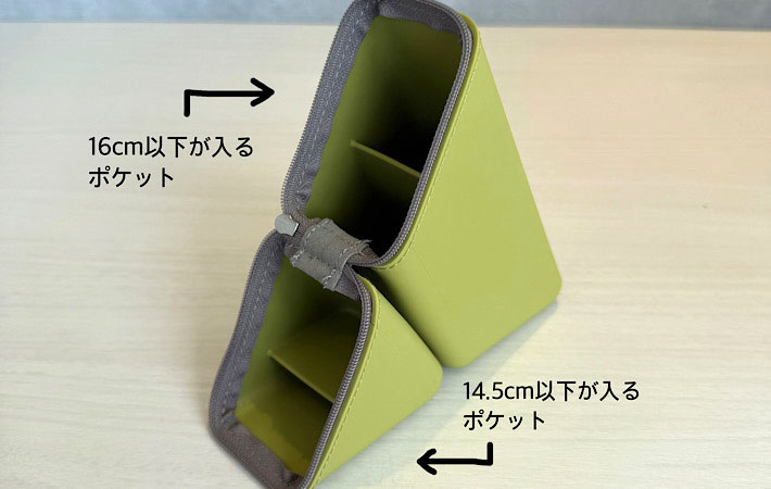 16cm以下のものが入る上部のポケットと、14.5cm以下のものが入る下部のポケットに分かれていて、それぞれ1つずつ仕切りがついています。