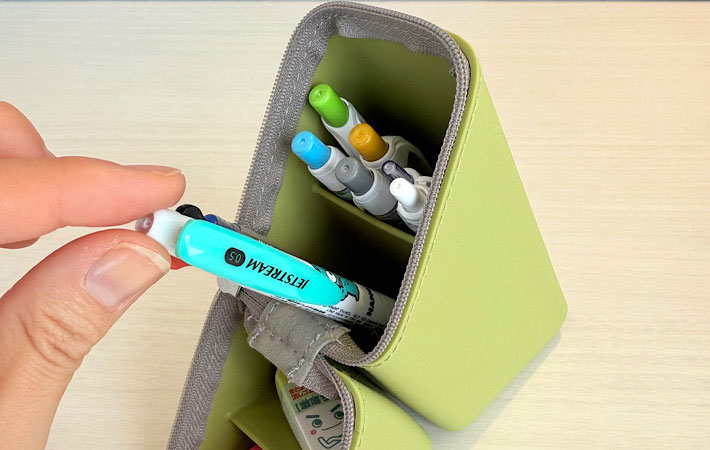 この角度が絶妙で、ペンが深く埋もれてしまうのを防ぎ、どのペンが入っているかひと目で分かるんです。