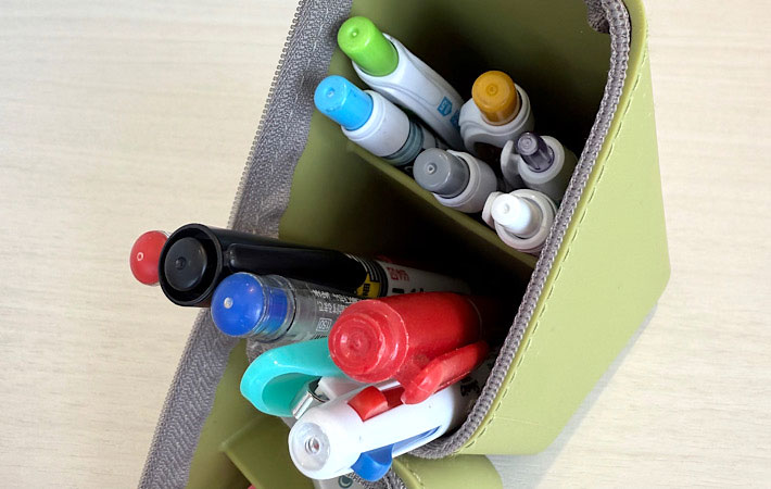 上部にはシャーペンやカラーペン、油性ペンなどのペン類を収納。