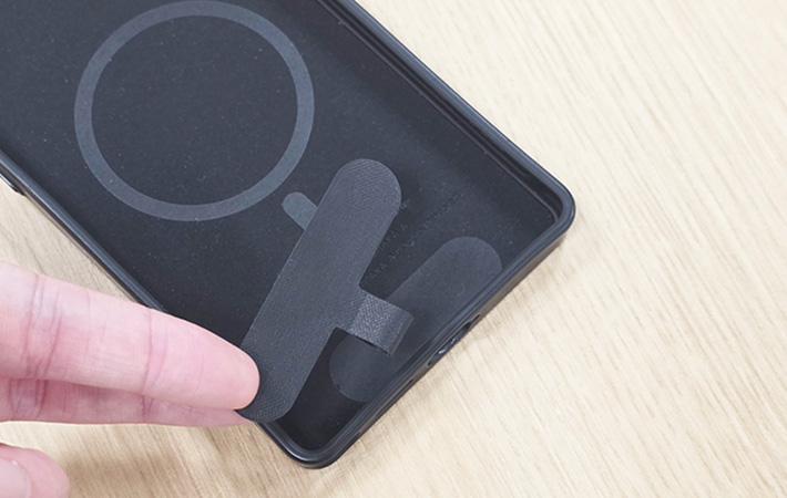 スマホ用のストラップとして使う場合は、付属の布製シートをスマホケースに挟み込み、飛び出したループ部分にリングを通します。