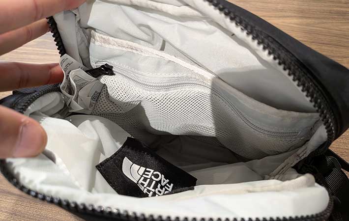 メインコンパートメントはダブルジッパーで開閉がしやすく、小物を入れやすいメッシュポケットなどを搭載。