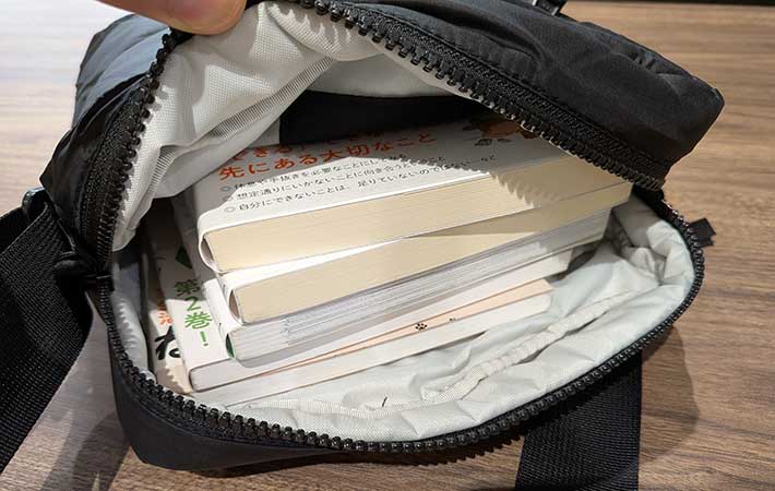 筆者は手近にあったA5、B6サイズの本を5冊突っ込んでみました。