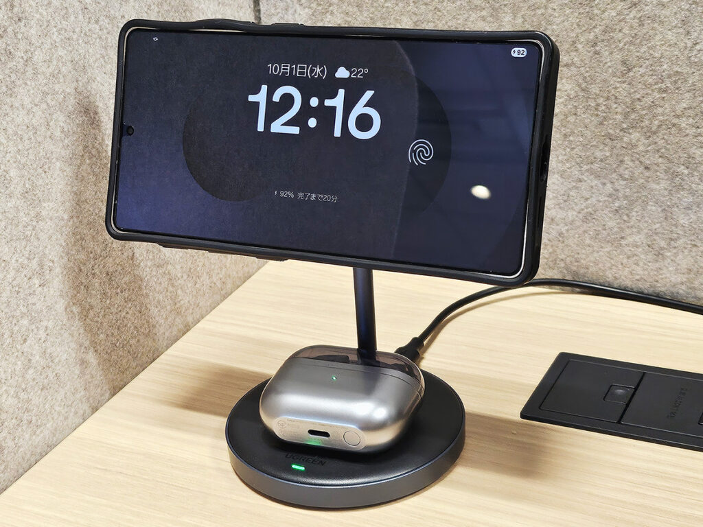 土台部分もワイヤレス充電に対応しているので、ワイヤレスイヤホンのような小型なデバイスもスマホと一緒に充電可能です。