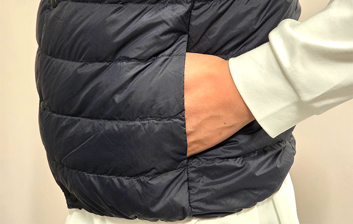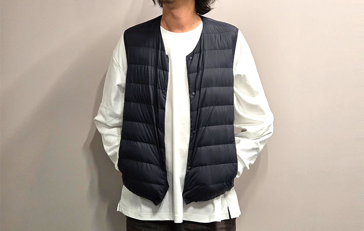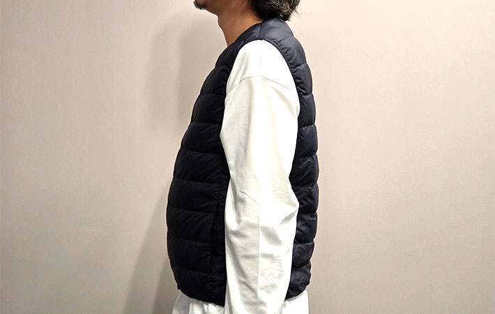 750フィルパワーは密度しっかり、それでいて軽量とバランスの取れた構成で、気軽に羽織れてちゃんとあたたかいベストといった印象です。