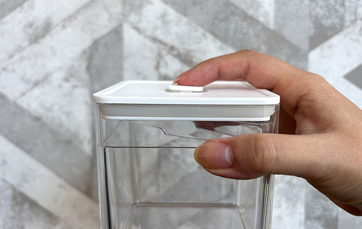蓋の中央に付いているバルブを押し込むだけで空気が抜けて、しっかりと密閉できます。