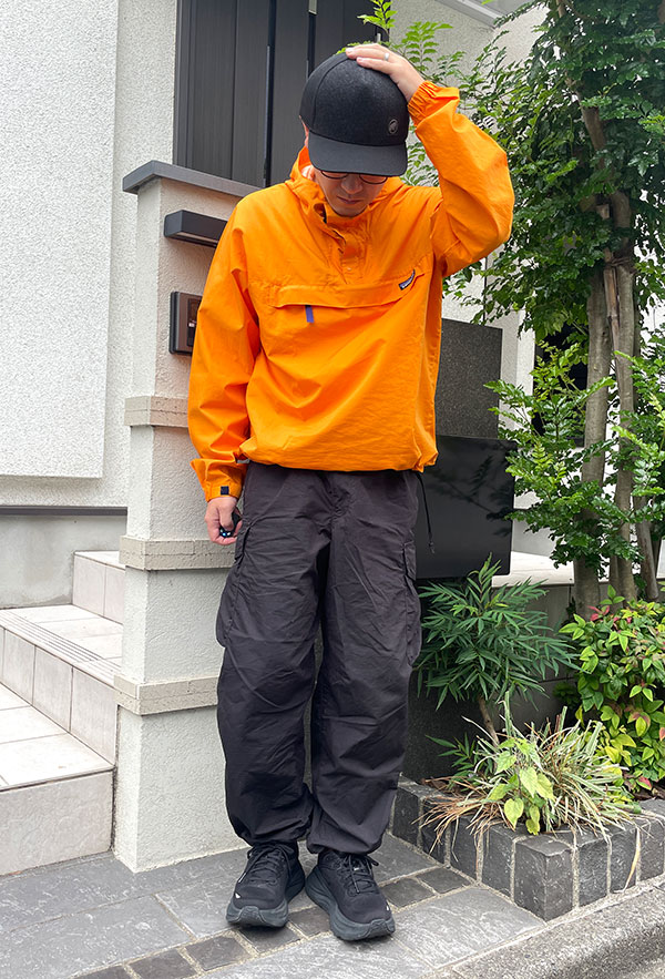 派手めなアウターに、今回の主役であるキャップとカーゴパンツを合わせてみました。