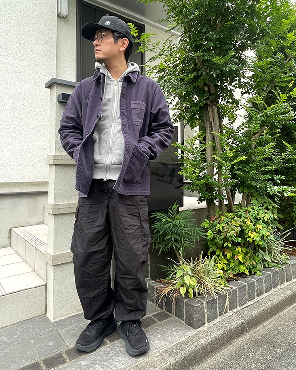 最後は、フードがついたパーカーとナス紺のカバーオール(お尻まで隠れるくらいのワークジャケット)をチョイス。カジュアルでルーズめな服と、相性がいいと感じました。