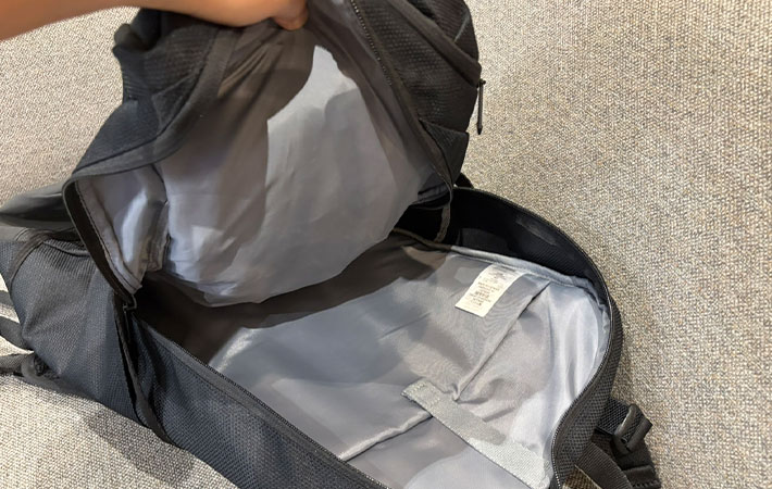 リュックの中は普段入れている荷物をそのままにしていますが、それ以上にリュックが大きいため、形が少々崩れてしまっています。