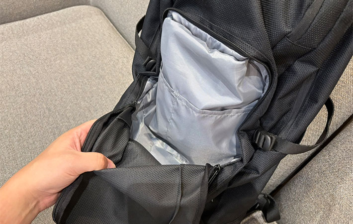 荷物を入れるスペースは大きく3か所あり、メインとなるスペースにはノートパソコンを収納できるスリーブが付属。