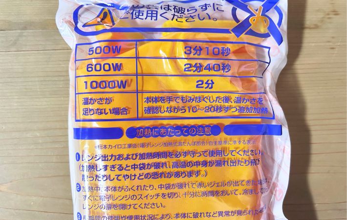中身のジェルが片寄っていたら手でもみほぐし、均一にならしてから加熱しましょう。