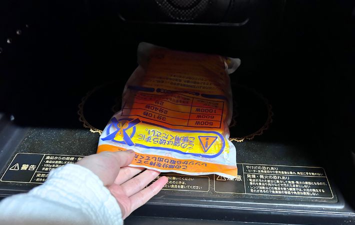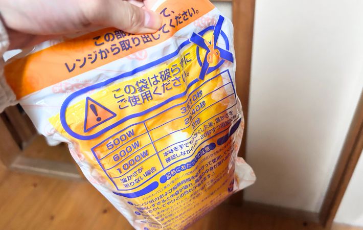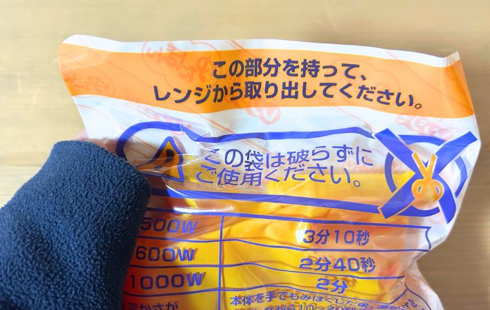 加熱が終わったらヤケドしないように袋の端っこを持って取り出します。