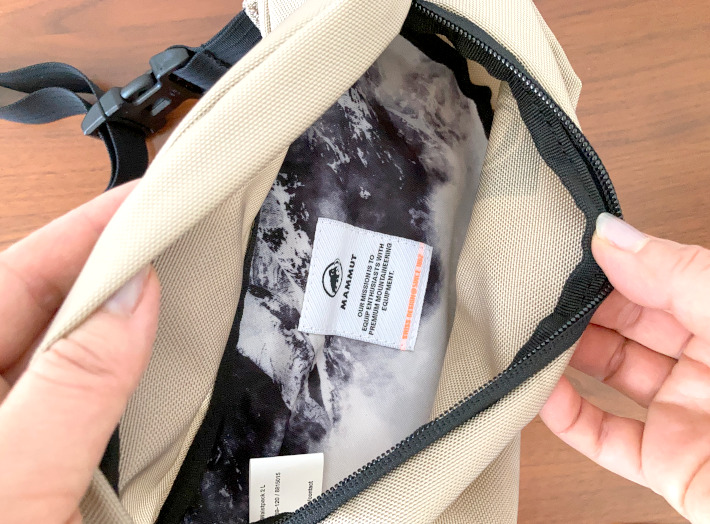 メインコンパートメントを開けてみると、おなじみのスイスの山のプリントとマンモスのロゴマークが!
