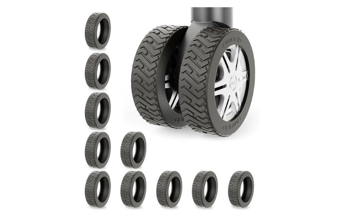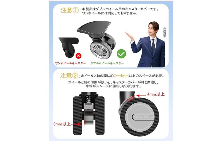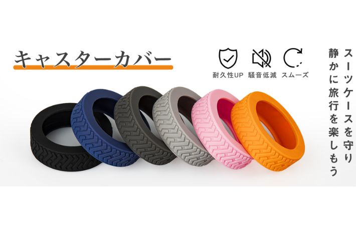 キャリーケースの車輪をすっぽり覆うことで、汚れ防止や騒音低減、傷防止の効果が期待できる商品。