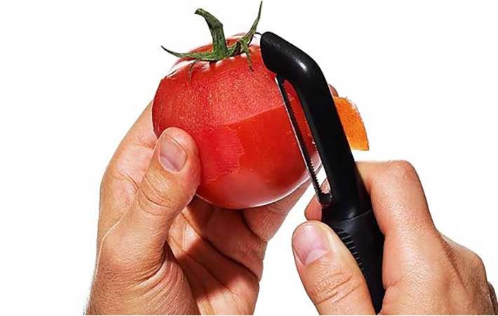 この細かいギザギザの刃が、包丁や普通のピーラーではむきにくいトマトやナス、桃やキウイなどの薄皮をしっかりキャッチ!