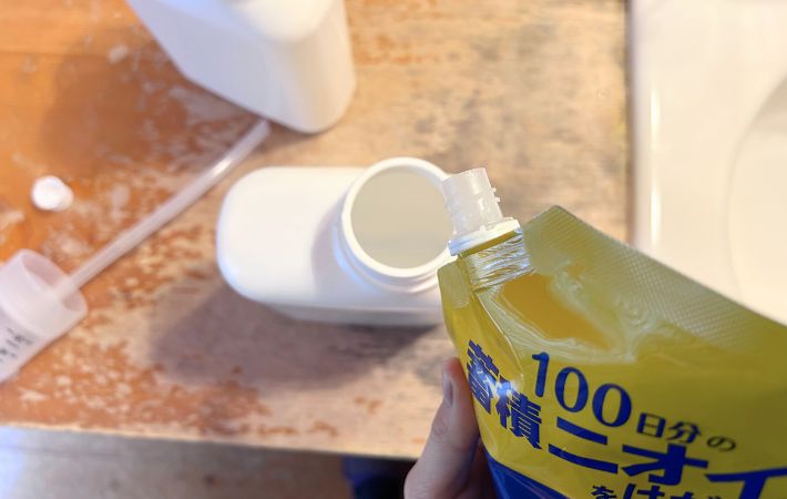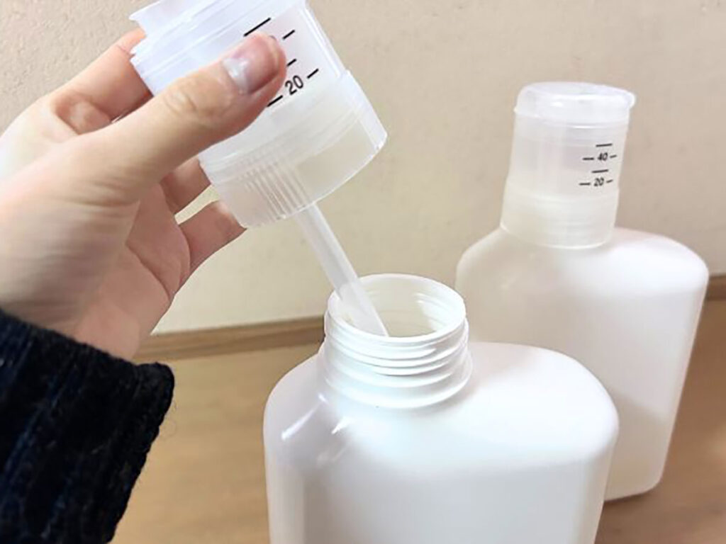 気を抜くと多めに入れてしまったり、こぼしてしまったり、手がヌルッとしてキャップが回しづらかったり…。