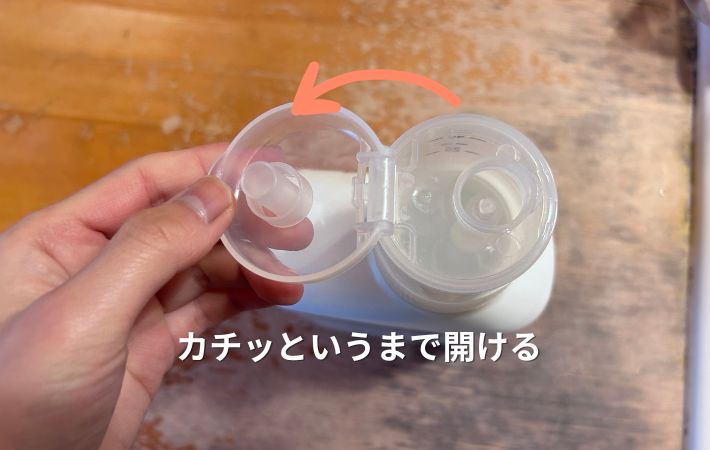 キャップをロック状態まで開けてボトル本体の中心を数回プッシュすると、勝手に計量してくれます。