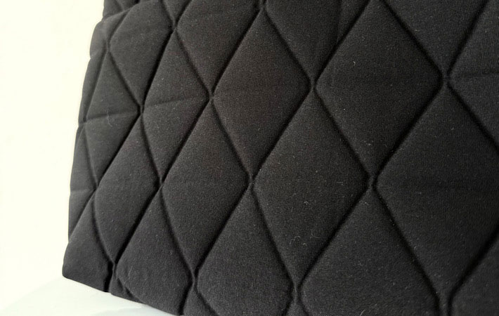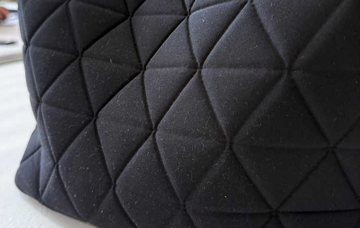 表面にはジオメトリック(幾何学的)なキルティング加工が施されていて、カジュアルさがほどよく抑えられた上品な雰囲気。