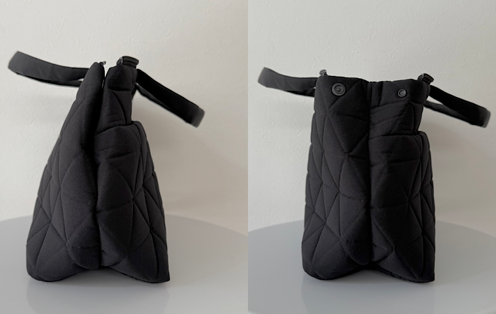 容量は通常の状態だと7Lほどですが、サイドのスナップボタンを外すと口が広がり、さらに2Lアップ!最大9Lまで入れることができます。