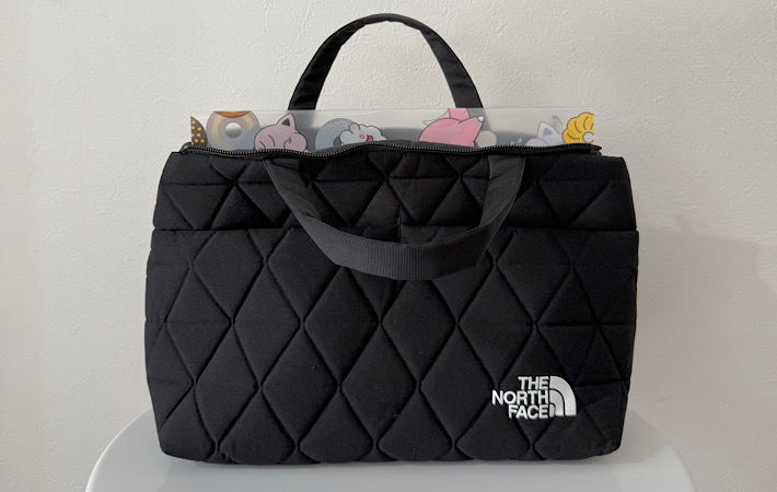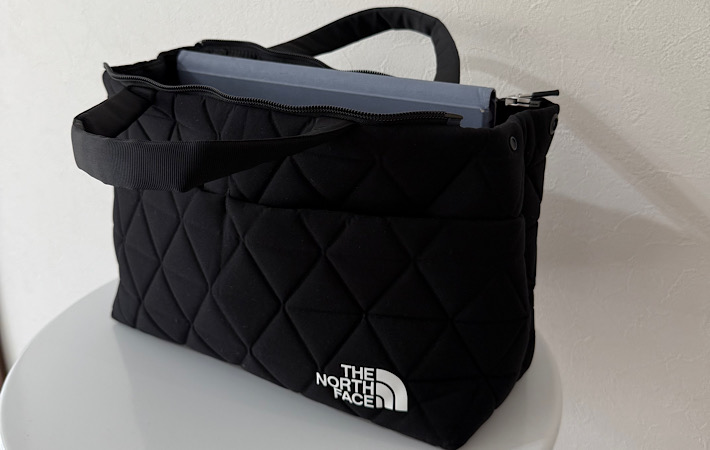 「これ最強の通勤バッグでは?」 ノースフェイス『ジオフェイスボックストート』が手放せなくなった理由 ファッション By - miu 更新:2025-11-14 ※本記事はUPDATEが独自に制作したコンテンツです。また、本記事を経由して商品の購入が発生した場合に、ECサイト等から送客手数料を受領することがあります。 リモートワークと出社が混在するようになった今、ノートPCやタブレット、モバイルバッテリーなど、ガジェットを持ち歩く機会がぐっと増えました。 大切なガジェット類を入れるバッグに求めるのは、やはり『衝撃から守れること』と『ビジネスシーンに馴染むデザイン』。 カジュアルすぎたり、クッション性が不安だったり…なかなか理想のバッグに出会えないという人も多いのではないでしょうか。 そんな条件を満たしてくれたのが、『THE NORTH FACE(ザ・ノース・フェイス)』の『ジオフェイスボックストート』です。 アウトドアブランドの確かな信頼性と、オフィスにも馴染むシックでモダンなデザインを両立した、「買ってよかった」と思えるトートバッグです! 「タフなのにシック」モダンなキルティングデザインがかっこいい! Amazonで見る 楽天市場で見る サイズ:高さ21cm×幅29.5cm×マチ15cm 容量:7L(スナップを外すと最大9L) 重さ:約200g ノースフェイスと聞くとスポーティーなイメージ。でもこのバッグを見た瞬間、「こんなにシックでモダンなトートがあったんだ」と驚きました。 表面にはジオメトリック(幾何学的)なキルティング加工が施されていて、カジュアルさがほどよく抑えられた上品な雰囲気。 スーツやオフィスカジュアルといったきれいめスタイルにも自然に馴染みます。ユニセックスなデザインなので、性別問わず使いやすいのもポイント。 素材は、クッション性のある80Dポリエステルジオエンボス素材が採用されていて、ガジェットの持ち運びにぴったりなんです。 しかも、重量は約200gとスマホ1台分程度。高級感のある見た目からは想像できないほどの軽さにも驚きました! 自立するボックス型で、使い勝手抜群! このバッグの最大の特徴は、しっかり自立するボックス型であること。 オフィスやカフェ、会議室の床に置いても倒れにくく、安定感があります。 荷物を出し入れしても、すぐに倒れて中身が飛び出してしまうことがないのはストレスフリー。 さらに、ファスナーを全開にすれば中身が一目で見渡せて、そのまま収納ボックスのように使えます。 車の中でも、座席に置いたままサッと財布やポーチを取り出せてとても便利でした。 高速の料金所や駐車場の精算であたふたすることもありません。 収納力は?見た目以上にしっかり入る 高さは大体550㎖のペットボトルとほぼ同じくらい。 容量は通常の状態だと7Lほどですが、サイドのスナップボタンを外すと口が広がり、さらに2Lアップ!最大9Lまで入れることができます。 荷物量に合わせて使い分けできるのが嬉しい! メインコンパートメントはクッション性がある作りなので、ガジェットを入れても安心感があります。 iPadはすっぽり収まり、13インチまでのノートPCも入ります。 ただ、A4サイズのクリアファイルを入れてみると、こんな感じではみ出してしまいました。 ファスナーを閉じたい場合は少し折れ曲がってしまうので、大切な書類には向かないでしょう。 でも、ファスナーを開けた状態で使えば問題なく持ち運べます。 子供の保護者会や学校行事用バッグにもぴったりだと思いました。 ポケットが多くて、整理がしやすい 内側にはファスナー付きメッシュポケットと、キークリップがついています。 メッシュポケットは充電器やケーブルなどの小物を入れるのに便利。中身が見えるので迷子になりません。 筆者は普段キーケースを持ち歩いているので、キークリップには自転車の鍵をつけています。 外側にはオープンポケットが2室あります。 スマホやウェットティッシュ、定期入れなど、サッと取り出したいアイテムを入れるのに便利。 ハンドルはクッション性があり、とても持ちやすい! 重い荷物を入れても手が痛くなりにくいと感じました。 実際に荷物を入れてみた! カフェで仕事をする時に使う荷物を入れてみました。 iPad キーボード 財布 スマホ ハンカチ&ティッシュ ウェットティッシュ キーケース 自転車の鍵 化粧ポーチ ペットボトル エコバッグ モバイルバッテリー 充電ケーブル 550㎖のペットボトルは縦に入れるとファスナーが閉まらなかったので、横にして収納。 これだけ入れても、メインコンパートメントはまだ余裕がありました。 モバイルバッテリーとケーブルは内側のメッシュポケットに、スマホとエコバッグ、ウェットティッシュは外ポケットに収納しています。 バッグの中で荷物がごちゃつかず、すっきりと整理できるのが嬉しいです。 気になった点 使ってみて、気になった点が3つありました。 埃が目立ちやすい ブラックはどうしても埃が目立ちやすいです。 こまめなお手入れが面倒な人は、グ
