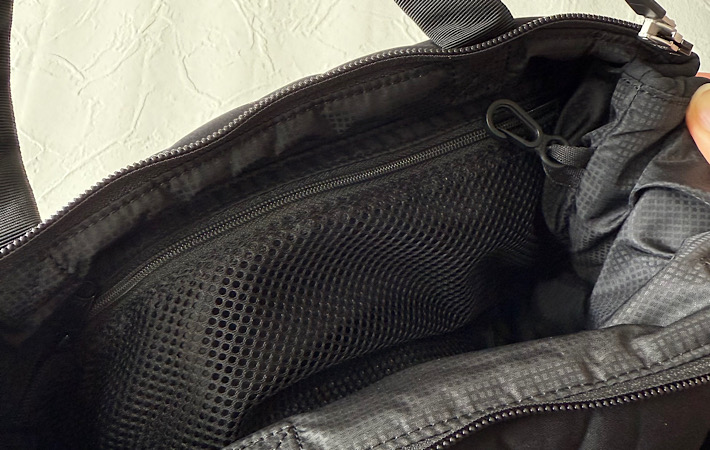 内側にはファスナー付きメッシュポケットと、キークリップがついています。