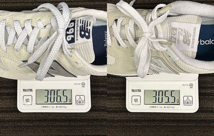 重さは『996』の片足が306.5gで、『574』が305.5gです。