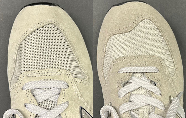 つま先を正面から見ると、まったく同じように見えますが、『996』『574』はアッパーのメッシュに違いがありました。