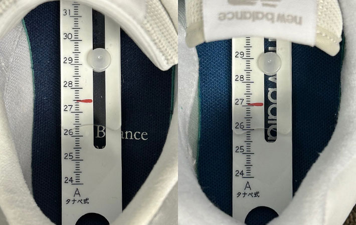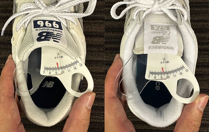 まずは、スニーカーの内寸を測れる専用の道具を使い、『996』『574』の内寸を見てみましょう!