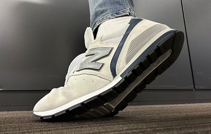 『996』はくるぶしあたりから、土踏まずへ向かうように、真っ直ぐにレザーを配置。レザーが差し色になっていますね。