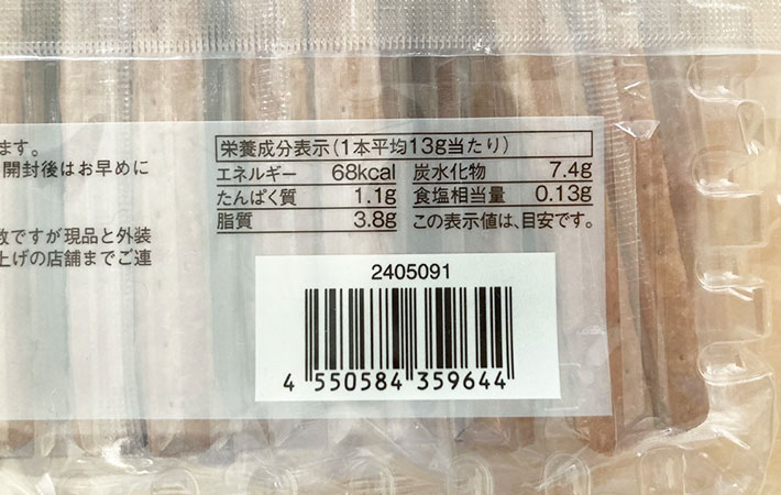 パッケージ裏面の栄養成分表示を見てみると、1本あたりのカロリーは68kcal。