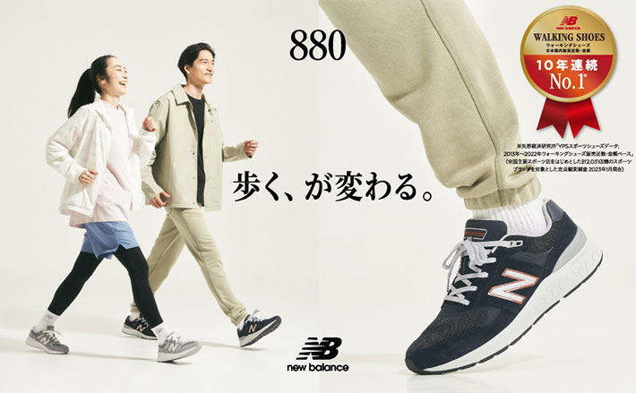 ニューバランスのウォーキングシューズ『880』を徹底レビュー「歩きやすさは?」「普段使いできる?」 ファッション By - UPDATE編集部 更新:2025-11-21 ※本記事はUPDATEが独自に制作したコンテンツです。また、本記事を経由して商品の購入が発生した場合に、ECサイト等から送客手数料を受領することがあります。 健康な体を維持するためには、適度な運動が不可欠。 しかし、なかなか運動する機会を作れず、慢性的な運動不足に陥っている人は多いと思います。 筆者も学生時代はテニスをしていましたが、働き始めてからは一度もする機会がなく…。 せめてもの運動で、ときどきウォーキングやジョギングをしています。 とはいえ、毎日何kmも歩いたり、走ったりする訳ではないので、専用のシューズを買うのはもったいない気がしていました。 そんな時に見つけたのがニューバランスのウォーキングシューズ『880』。 Amazonで見る Amazonの『ウォーキングシューズ売れ筋ランキング』でも上位にランクインしている人気のスニーカーです。 ウォーキング用に作られているスニーカーですが、普段使いできそうなクラシカルなデザインに魅力を感じました。 早速購入し、実際に履いてみた感想を紹介します! 目次 1. ニューバランス『880』ってどんなスニーカー?1.1. ウォーキング用にアレンジされたミッドソール『REVLITE X』1.2. 自然で安定した歩行をサポートする技術1.3. 甲高・幅広の足にも対応できるウィズ展開2. 実際に履いて歩いてみると…?2.1. さらに安定性を高める靴ひもの結び方3. 普段使いもできる? コーデ例をチェック ニューバランス『880』ってどんなスニーカー? ニューバランス『880』の個人的な評価がこちら! ・クッション性 ★★★★☆ ・軽さ ★★★☆☆ ・走りやすさ(歩きやすさ)★★★★☆ ・疲れにくさ ★★★★☆ ・ファッション性 ★★★☆☆ 今でこそファッションアイテムとしてのイメージが強いニューバランスですが、もともとは偏平足などを治す矯正靴の製造メーカーでした。 そのノウハウを活かして作られたスニーカーは、履き心地に定評があります。 中でも『880』は、ニューバランスの最新技術を結集して作られた人気のモデル。 ウォーキング用とランニング用があり、それぞれバーションアップを重ねています。 筆者が購入した『Walking 880 v5』は、Amazonで9000円を切っていて、有名ブランドのウォーキングシューズとしてはお手頃価格な印象。 Amazonで見る 最新の『v6』ではないものの、ウォーキング初心者の筆者には十分すぎるスペックを備えています。 その魅力を深堀りしていきましょう。 ウォーキング用にアレンジされたミッドソール『REVLITE X』 ミッドソールには、ニューバランス独自のクッションテクノロジー『REVLITE X(レブライトX)』を搭載。 反発性とクッション性という、相反する機能をバランスよく備え、軽量性と耐久性にも優れています。 主にランニングシューズに使用されている『REVLITE X』ですが、しっかりウォーキング用にアレンジされているそうです。 自然で安定した歩行をサポートする技術 アウトソール中央には、『Walking Strike Path』という溝が施されています。 ※白い溝が『Walking Strike Path』 この溝は、歩く時のかかとからつま先までの体重移動の軌道に沿って入れられていて、自然で正しい歩き方をサポートし、クッション性を高める効果もあるのだとか。 また、アウトソールを横に走る溝が多いことにより、屈曲性にも優れています。 一般的にクッション性が高いと安定性が失われる傾向がありますが、かかと部分に搭載されている『CRカウンター』がかかとをしっかりとホールドしてくれるので、安定感があります。 ウォーキングに特化し、歩きやすさをとことん追求した1足です。 甲高・幅広の足にも対応できるウィズ展開 ※ニューバランスのウィズサイジング 『Walking 880 v5』のウィズは、メンズは2Eと4E、レディースはDと2Eの2ウィズ展開です。 甲高・幅広の足が多いといわれる日本人に、よりフィットする作りになっています。 つま先がゆったりしているので、外反母趾の人もぜひ試してほしいです。 実際に履いて歩いてみると…? 思ったよりもクッションが硬いかな? これが、筆者が『Walking 880 v5』を実際に履いた時の第一印象です。 クッション性が高いと聞いていたので、足が沈み込むようなフワフワとしたクッション性を期待していたのですが、少し違いました。 かといって履き心地が悪い訳ではなく、体重をかけると程よく跳ね返すような弾力があります。 むしろフワフワのクッションよりも安定感があり、長く歩いても足が疲れにくく感じました。 また、ソールの屈曲時の跳ね返りもよく、足が自然に前に出るような感覚もあります。 厚みのあるシュータンが足の甲をしっかりと支え、アッパー全体が足をしっかりと包み込んでくれているので、とにかく安定感が抜群でした。 さらに安定性を高める靴ひもの結び方 ウォーキングをする時におすすめの『ヒー