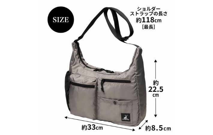 落ち着いたグレージュカラーとポイントのブラック、シンプルなロゴタグが映えるかっこいいビジュアルのショルダーバッグ。