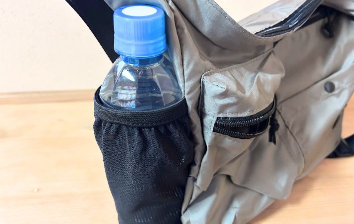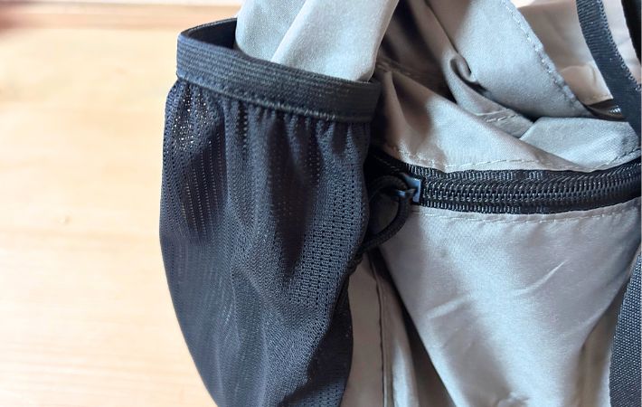 サイドについているメッシュポケットには伸縮性があり、少し大きめのペットボトルや水筒、折りたたみ傘がすっぽり収まります。