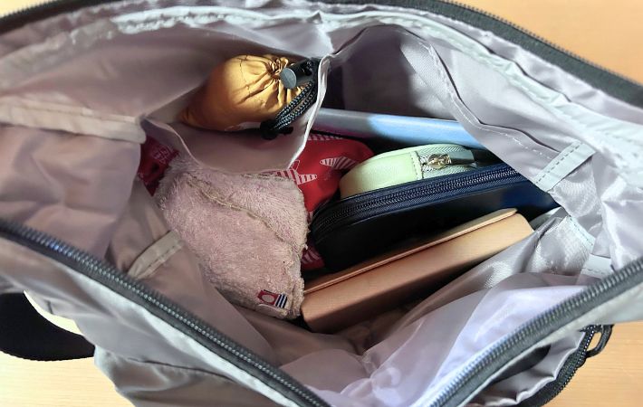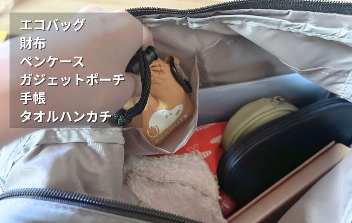 財布や手帳、メガネケース、エコバッグといった必需品はもちろん、大きめのポーチまでしっかり収まり、荷物の少ない筆者にとっては十分すぎるくらい。