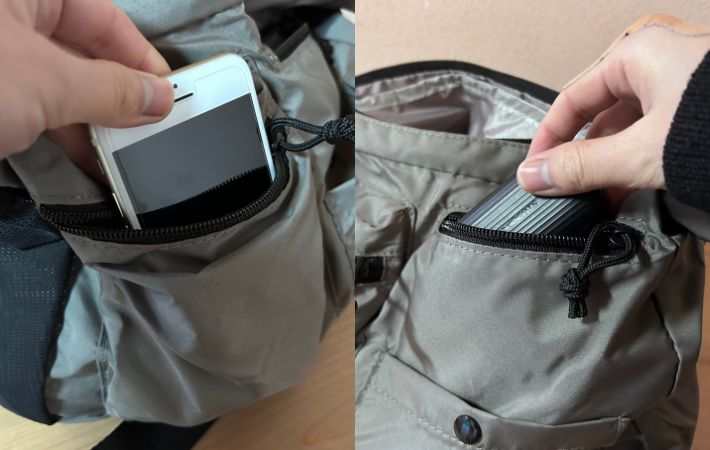 外ポケットにスマホやワイヤレスイヤホンなどのすぐ取り出したい小物を分けて入れてもまだまだ余裕があります。