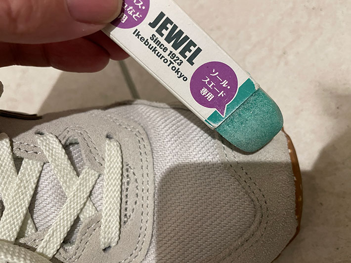 シューケア用の消しゴムは、強くこするとスエードが削れて不格好になってしまうので、優しくかけるのがポイント。