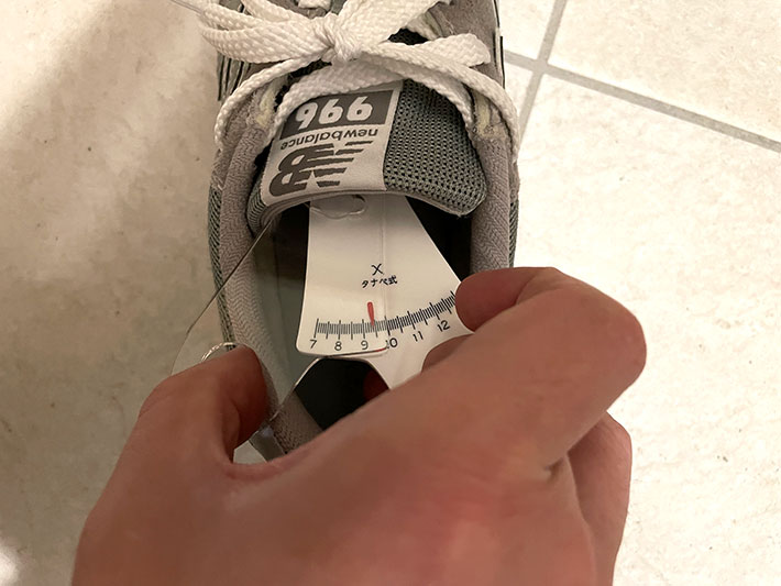 しかし、外見からは正確なサイズが分からないので、26.5cmの『996』と『574』の一番広くなっているところの内寸を、専用の定規で測ってみました。