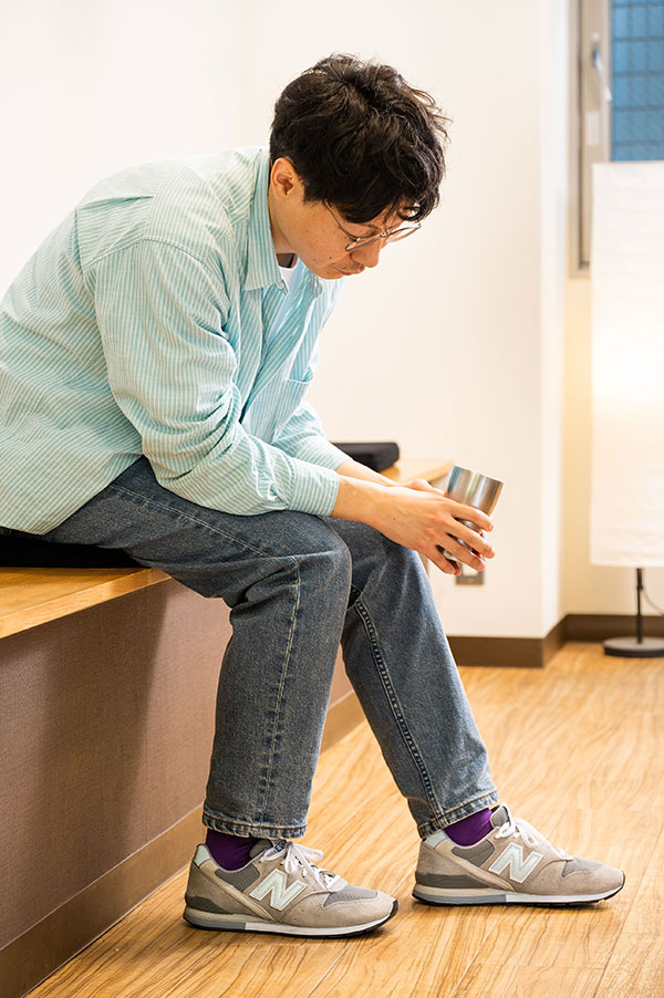 シャツに入った白のラインと、スニーカーの色味を合わせています。