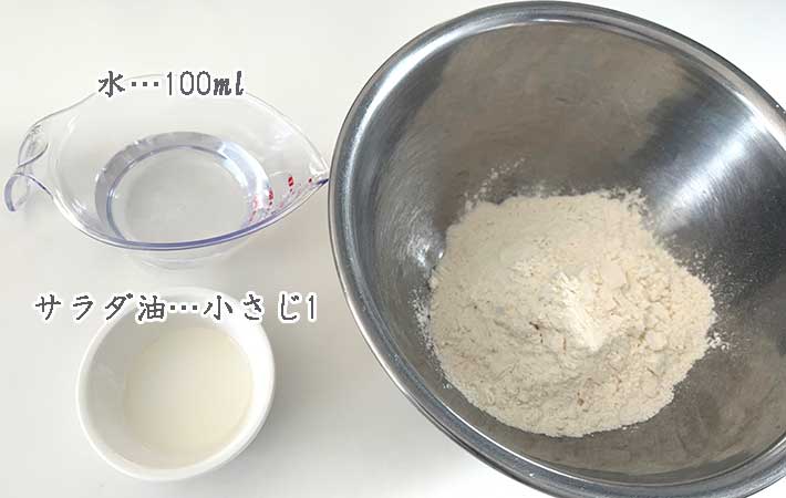 ボウルに『フライパンで作る ナン』を全量入れ、水100㎖とサラダ油小さじ1を入れて、ヘラを使って混ぜ合わせます。