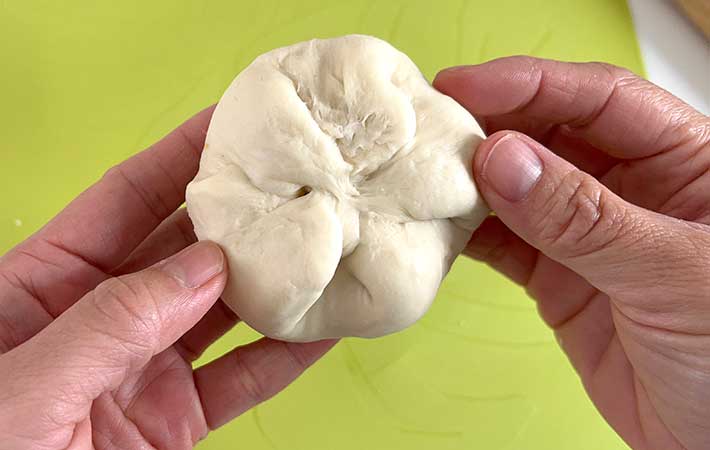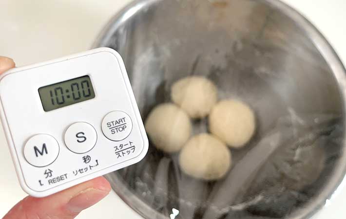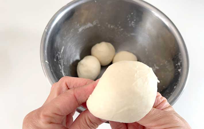 5分ほどよくこねた生地を、4等分して丸め、ボウルに入れます。