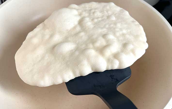 伸ばした生地を中火で熱したフライパンに載せてフタをし、表面がポコポコ膨れてくるまで1~2分焼きます。