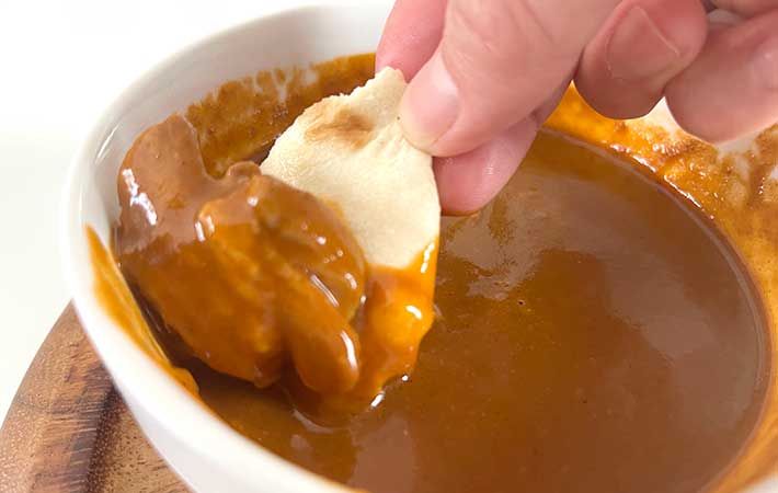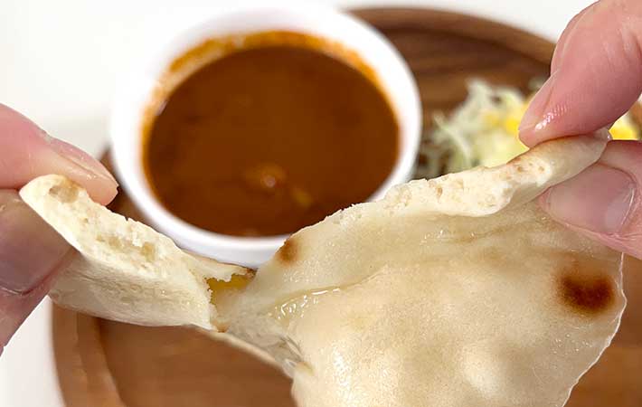 ほんのり甘い生地とバターの風味で、このまま1枚ペロリと食べられちゃいそうなおいしさですが、一口大にちぎったナンにバターチキンをまとわせると…。