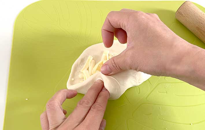 伸ばした生地の中心にピザ用チーズを30g載せ…。