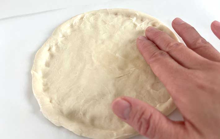 再びめん棒で直径15cmの円形になるまで伸ばし、形を整えます。