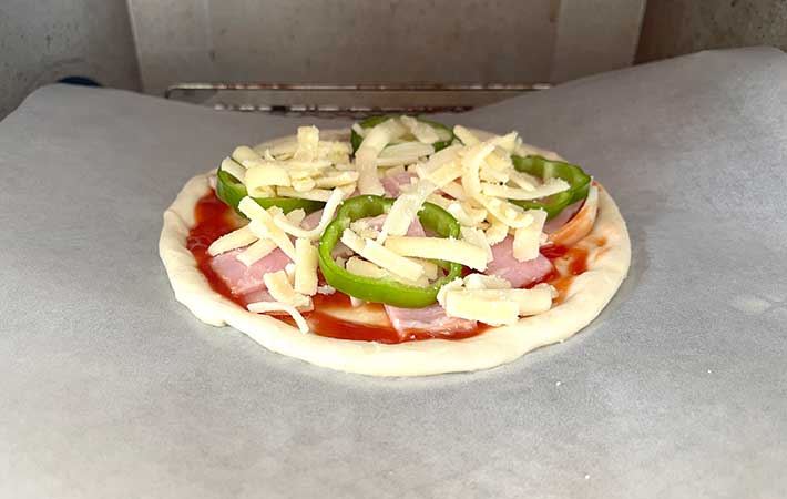 生地にケチャップを塗り、ピザの具材を載せ…。