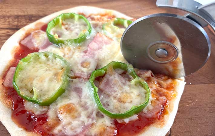 おいしそうな一人前サイズの焼きたてピザの完成です!