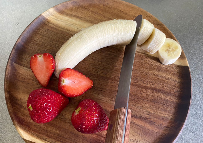 いちごやバナナ、ミカンを小さめのナイフでカットすると、スパッ!いつものまな板と比べてもそん色ない使い心地です。