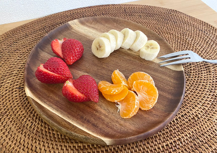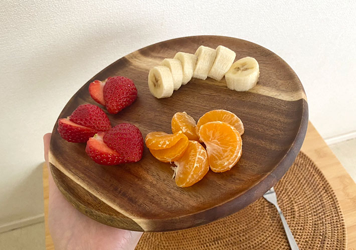 軽くて割れにくい木製なので、子供用のお皿や、ままごと遊びのおもちゃとしてもおすすめです。