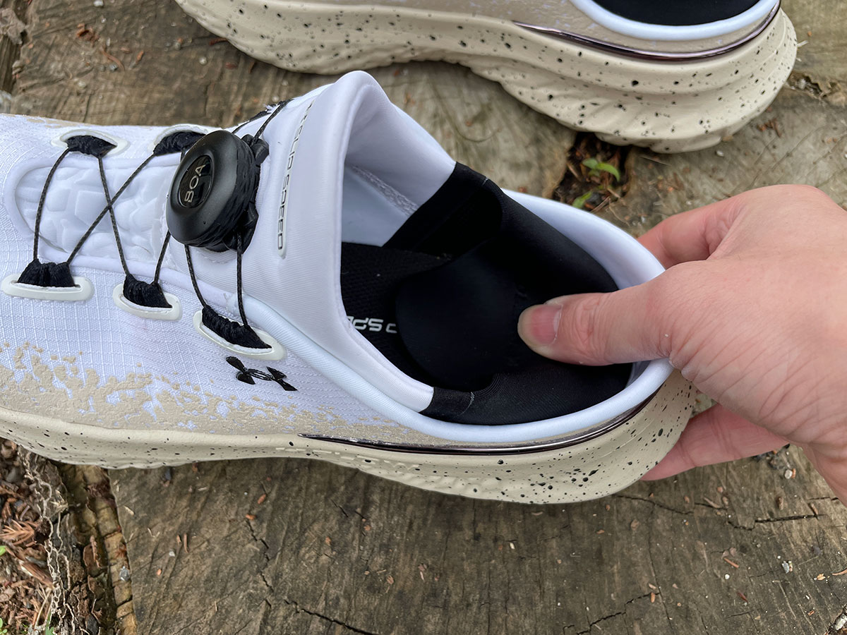 その本末転倒な作りに首をかしげていましたが、スリップスピードはカカト部の反発力がすごく、中足部がホールドされているのをしっかりと感じます。