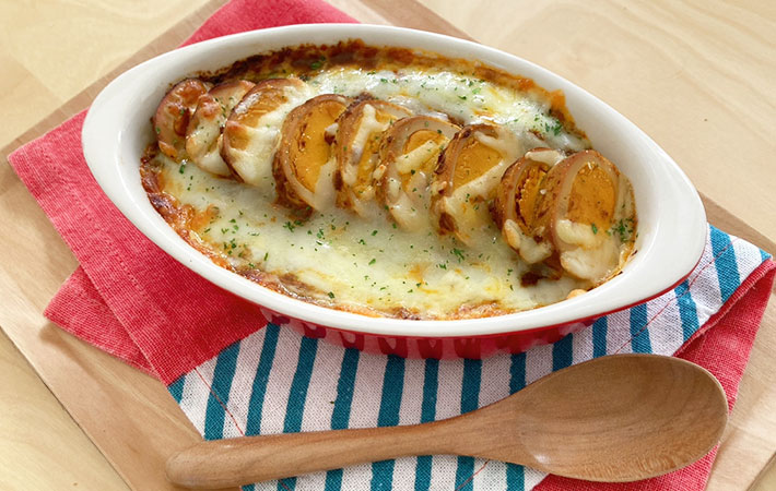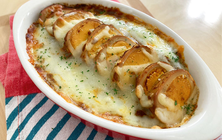 バターを塗った耐熱皿に温めたご飯と『たまごカレー』のルーを入れて、切ったゆで卵とチーズをトッピング。トースターで、チーズに焼き目が付くまでしっかり焼いたら完成です。