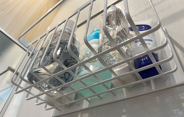 これらを収納するために、備え付けの棚があればいいのですが、棚がなかったり、また、棚があっても収まりきらなかったりすると、浴槽のフチやカウンターに直置きするしかないですよね。